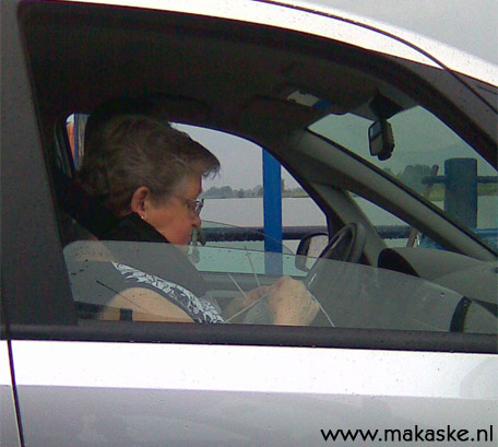 Een verfrissend buitje tijdens het stikbenauwde weer geeft blijkbaar genoeg aanleiding om je op te maken voor een koude winter. Op de pont naar Wijhe zat deze mevrouw bij 28 graden geitenwollen sokken te breien. Tja... je moet toch wat?