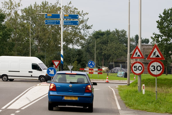 Drie uur later is de snelheid alsnog naar beneden afgerond tot dertig kilometer per uur. Het max. 50 km/uur bord is weggehaald. Het lijkt mij overbodig, want ik zou graag de automobilist willen fotograferen die met 50 km/uur deze rotonde op rijdt.