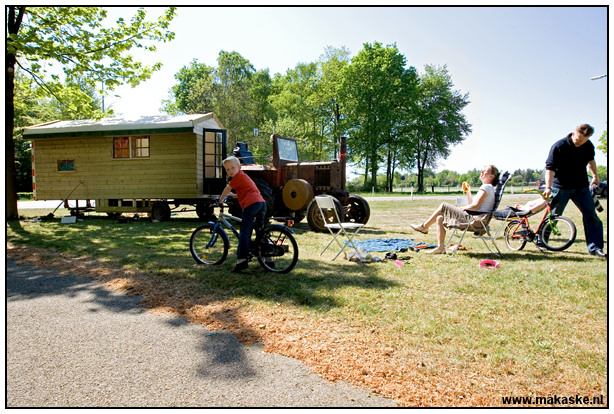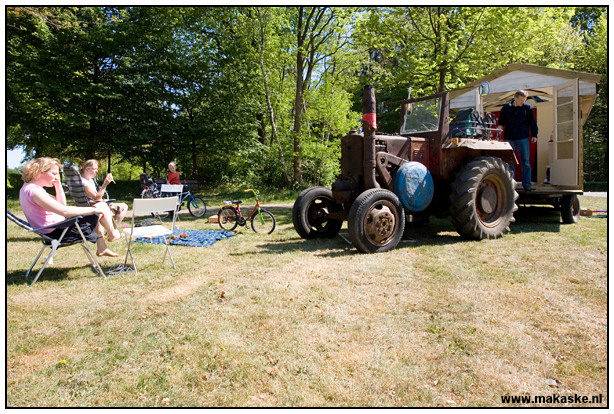 De familie De Bunt uit Dieren geniet van het mooie weer terwijl ze zijn gestrand met een lekke band langs de Tongerenseweg. Nadat de band was vervangen, ging de reis - met de eigenbouw caravan achter een Poolse Ursus trekker uit 1961 - verder richting Uddel.