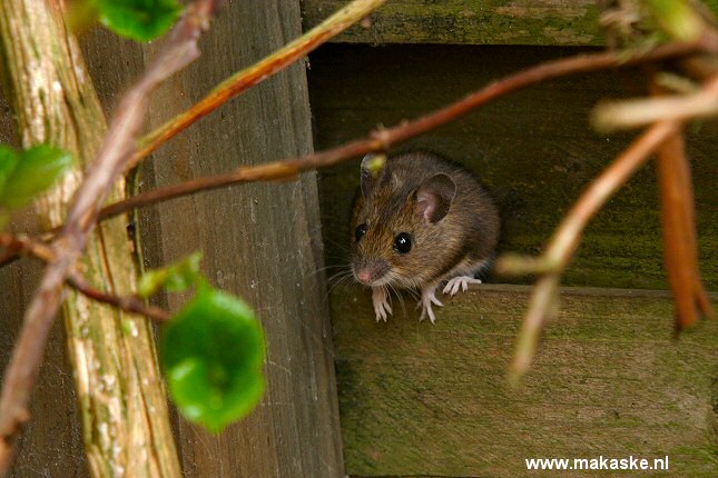 Onder de vogelvoederplaats loopt ook regelmatig 'onze' huismuis. Vanmiddag was hij er weer. Het was mooi weer dus redenen genoeg om de fotocamera maar eens op het statief te draaien.