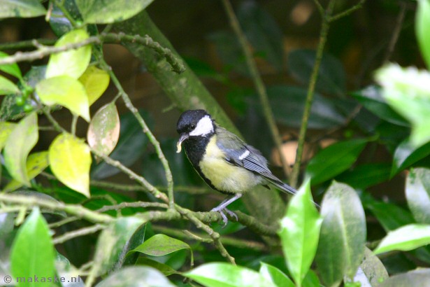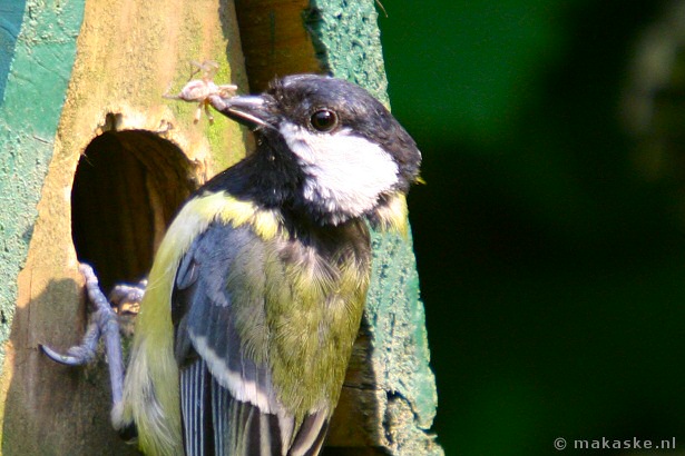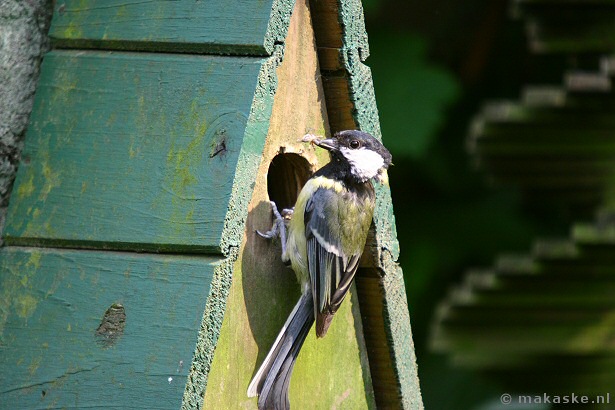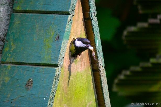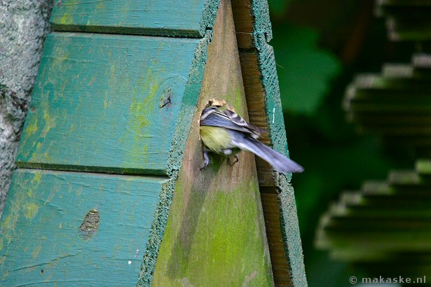 In één van de mezenkastjes (eigenlijk de mezenbouwval, omdat het kastje van ellende uit elkaar dreigt te vallen) zijn de jongen uit het ei gekropen. Pa en ma zijn druk aan het voeren.