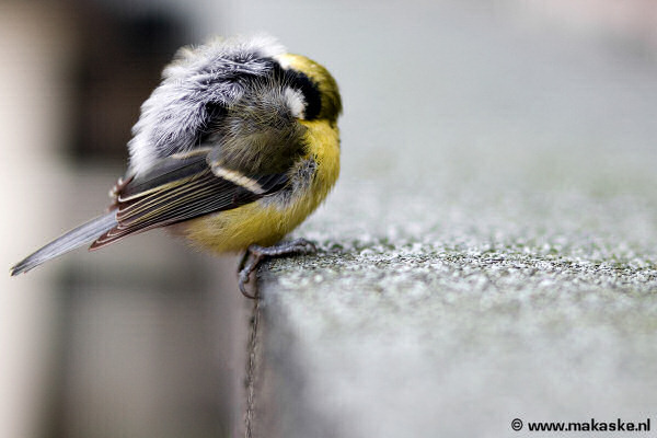 Vandaag zag ik dit oude koolmeesje ineengedoken op de dakrand zitten. Verkleumd door de kou stond hij op het punt om zijn laatste adem uit te blazen. De winter begint zijn tol te eisen.