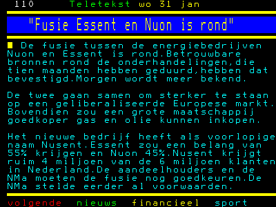 Tja en staan we nu aan de vooravond van de fusie van de energiereuzen Nuon en Essent. Samen goed voor vier miljoen van de zes miljoen aansluitingen in Nederland. Er is dus weer een monopolist geboren. Ze gaan zich Nusent noemen. Nonsens had mij beter geleken.