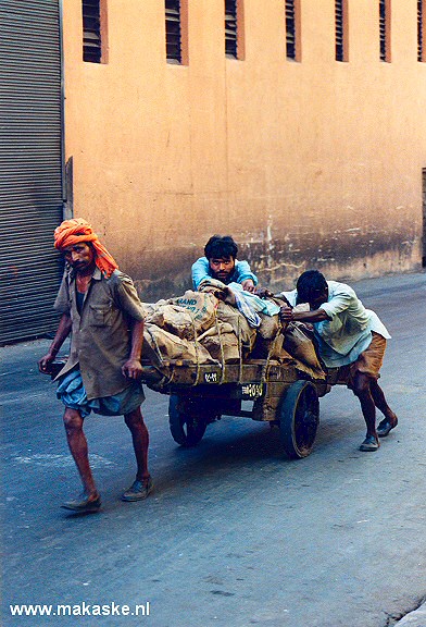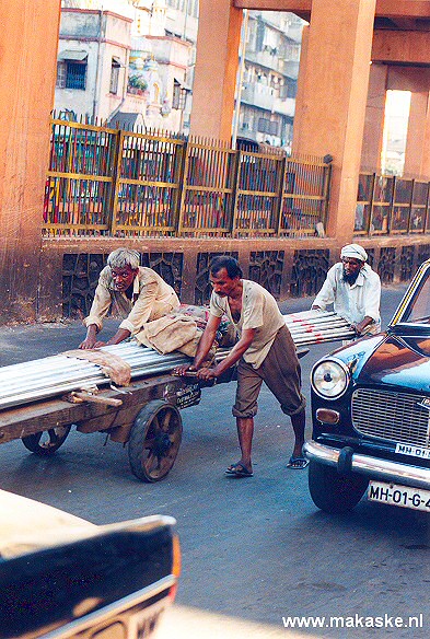 Omdat in Mumbai (Bombay) praktisch geen vrachtverkeer wordt toegelaten in de stad en mensen goedkoper zijn dan dieren, worden ze massaal ingezet om zware goederen door de stad te duwen (ook tegen heuvels op). Het is milieuvriendelijk, maar daar is dan ook alles mee gezegd.