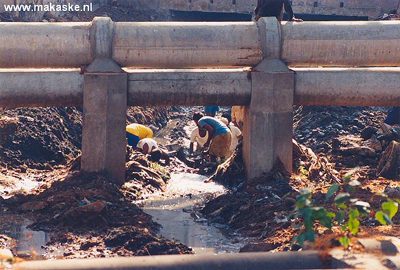 Daklozen zoeken in het open riool naar 'waardevolle' goederen.