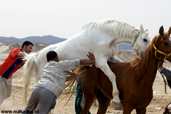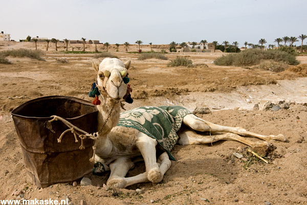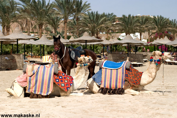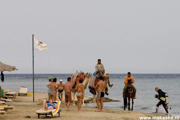 Zoals op ieder toeristenstrand liggen bij ons ook VVV-kamelen en paarden te pronken om de westerse toeristen een beetje het idee te krijgen dat ze in Egypte zijn. Tegen betaling mag je een ritje maken.