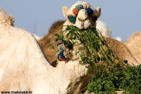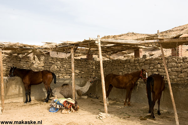 De paarden en kamelen hebben een voerbak of een ton met eten en er krijgen een paar keer per dag vers gras.