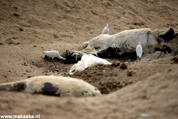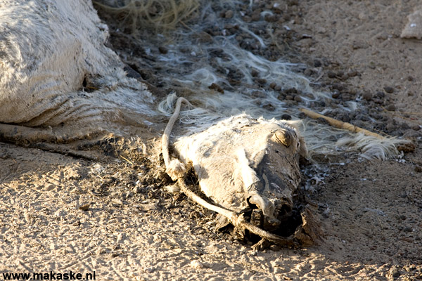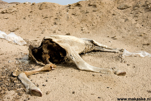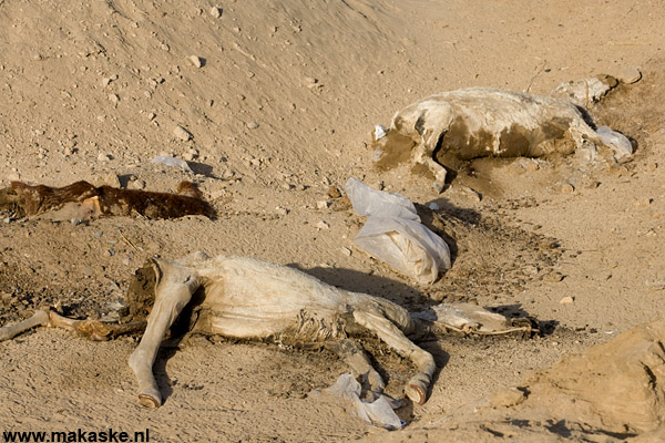 Dat leven en dood echter dicht bij elkaar liggen in Afrika blijkt als we iets doorlopen. De zoete geur van paarden, kamelen, hun eten en poep gaat over in een verstikkende walm van rottende kadavers. Achter de stal treffen we de lijken van drie paarden.