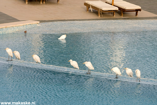 Maar waar ken ik die vogels ook alweer van? Oh ja... dat zijn dezelfde die zich 's avonds in het zwembad van het hotel even 'gezellig' komen ontspannen...