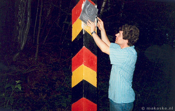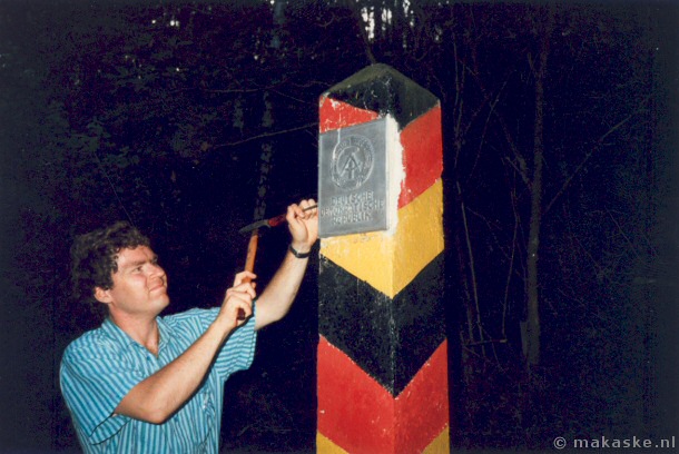 Tijdens het scannen van allerlei reisfoto's voor de fotogallery kwam ik deze foto's uit 1987 tegen. Op weg naar Polen passeerden Henk en ik uiteraard de grens van de DDR. Met de gereedschapskist uit de Toyota van mijn vader sloopten wij vlak bij één van de wachttorens dit DDR-grensbordje van het IJzeren gordijn. Direct nadat we ons uit de voeten hadden gemaakt, kwam de grenzpolizei polshoogte nemen.