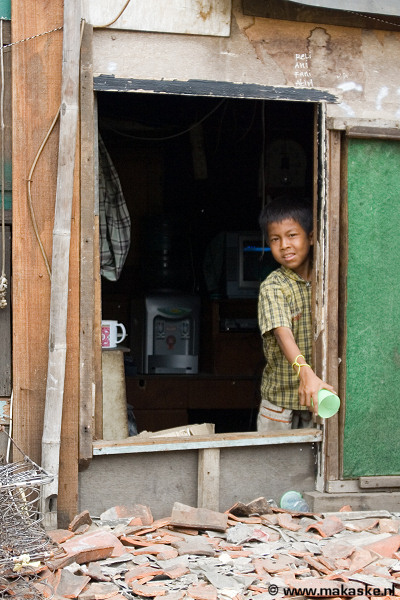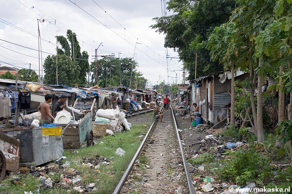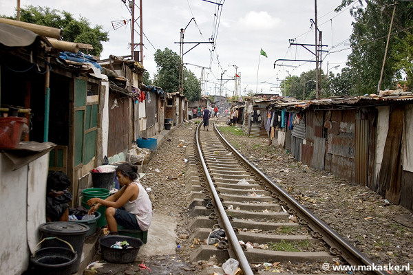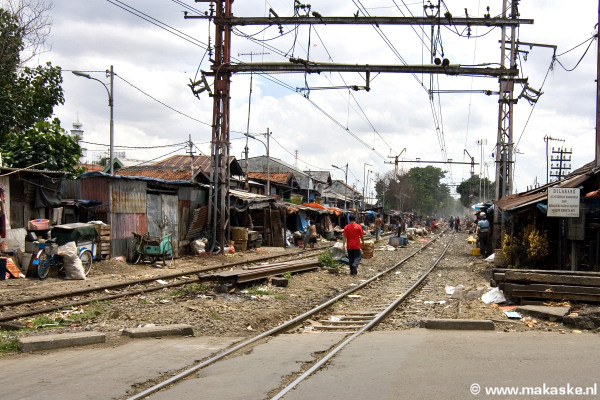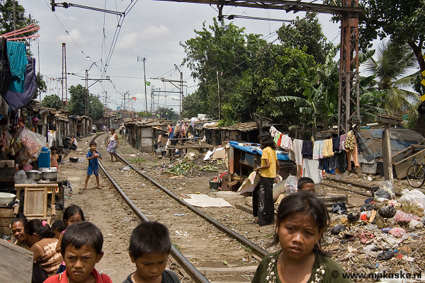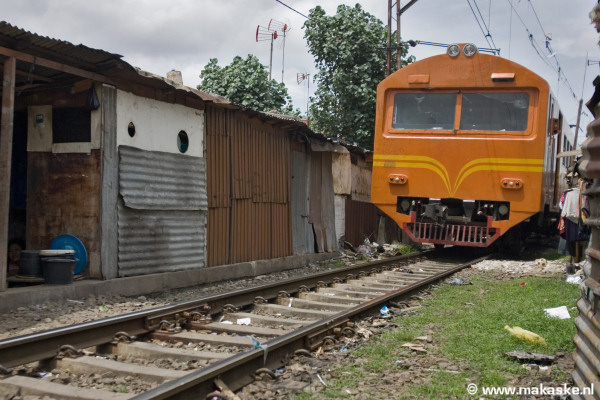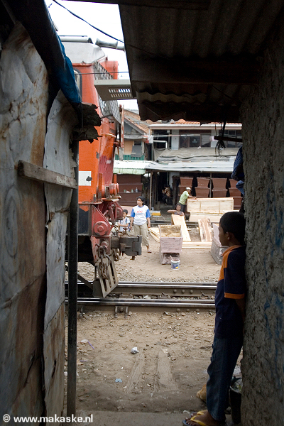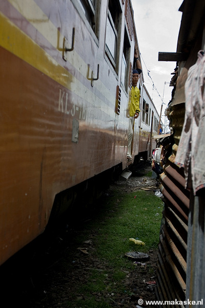 Een grote personentrein dendert met 40-50 kilometer per uur voorbij. Ik steek mijn camera tussen een hutje en de trein in de hoop dat hij niet wordt geraakt door de mensen die uit de trein hangen. Dit is echt een van de meest bizarre ervaringen in mijn leven. Hebben wij in Nederland collectief last van het NIMBY-syndroom (not in my backyard)... Het leven voor de mensen op deze locatie is uitermate overzichtelijk: ze hoeven niet na te denken over het NIMBY-syndroom. De trein raast voor de voordeur en een achtertuin hebben ze niet. Jaarlijks komen diverse bewoners om het leven (in tegenstelling tot b.v. Mumbai, waar alleen al in die stad jaarlijks ruim 5000 mensen in en om de trein omkomen - en dan hebben we het niet over botsingen met auto's - houden ze hier geen statistieken bij). Je kunt je geen fout permitteren want de trein is dodelijk. Er hangen allemaal mensen uit de trein en voor je het weet, heb je een voet in je nek. Krankzinnig!