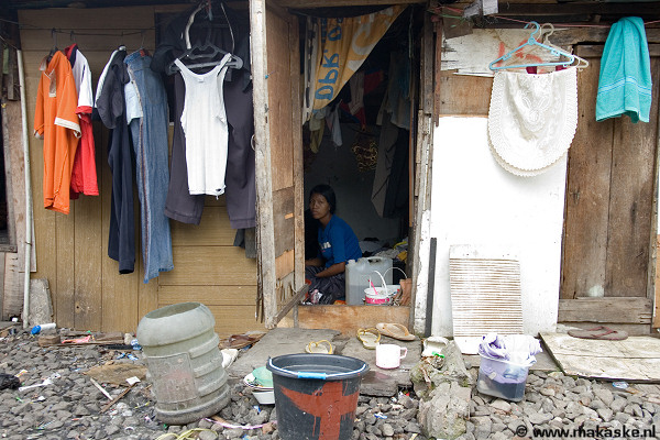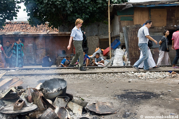 Ook op deze locatie bezoeken we enkele gezinnen. Dit zijn voornamelijk bedelaars. Ze zingen of zeulen met een baby - die je voor dat doel kunt huren in Jakarta: serieus er is een plein waar de baby's worden aangeboden - langs de auto's voor de stoplichten. Ik klim over een smalle trap omhoog om een kamertje van een moeder te bezoeken. Ze leeft hier met enkele kinderen. Voor een plek van nog geen twee bij twee meter betaalt ze 250.000 roepia per maand. Dat is omgerekend 22 euro... een godsvermogen voor mensen die amper meer dan een euro per dag verdienen. De stichting beperkt zich op deze locatie tot het monitoren van de kinderen en het stimuleren om ze naar school te sturen. Er is geen fysieke ruimte om een klaslokaal neer te zetten, dus informeel onderwijs is onmogelijk. Ook worden er geen microkredieten verstrekt omdat deze bewoners te onbetrouwbaar zijn. Lies zegt het diplomatieker... 'ze zijn tè arm', maar haar nonverbale communicatie zegt genoeg.