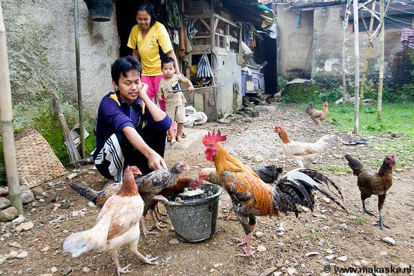 Een boer voert zijn loslopende kippen. De kinderen lopen er tussendoor te spelen (uitwerpselen van pluimvee zijn risicofactor nummer 1 bij de besmetting met vogelpest).