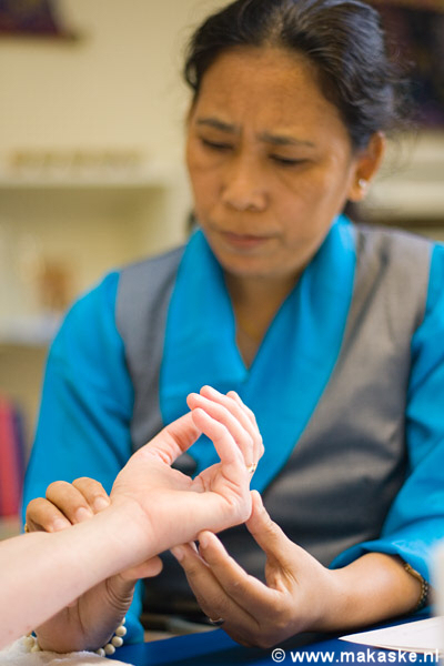 De Amchi voelt de pols. Het voelen van de pols gebeurt zowel rechts als links en geeft een Amchi meer informatie dan uitsluitend het aantal slagen van het hart.