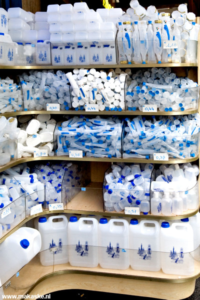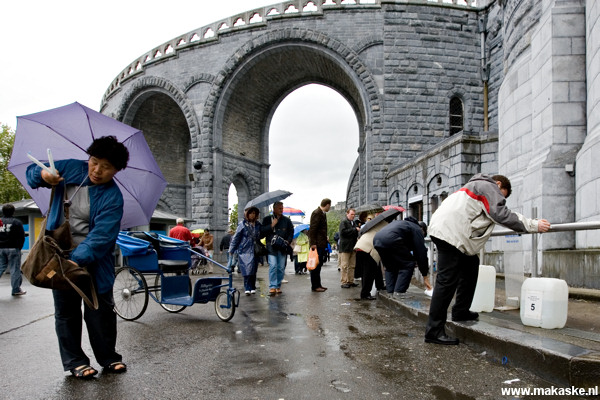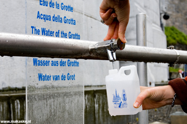 Voordat je de poort doorgaat naar de grot, ontkom je er niet aan om je eerst door een groot commercieel circus te worstelen. Winkels vol met plastic jerrycans in alle soorten en maten. Van kleine traditionele vierkante exemplaren via allerlei plastic en glazen flesjes in de vorm van Maria tot grootverbruikverpakkingen van tien liter. En alles uiteraard voorzien van een stempel van Lourdes.