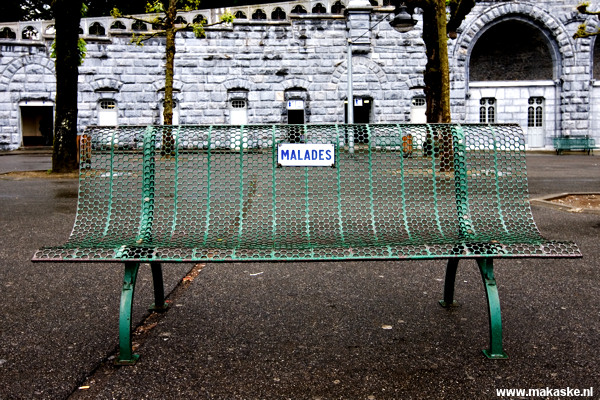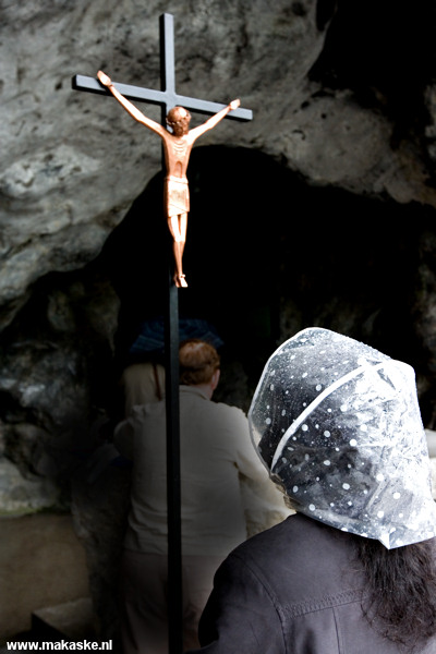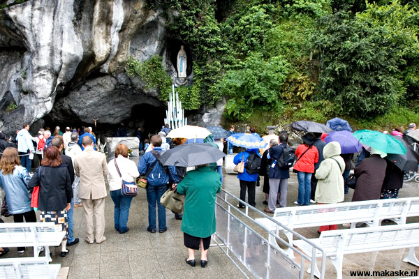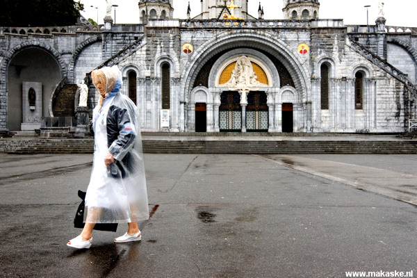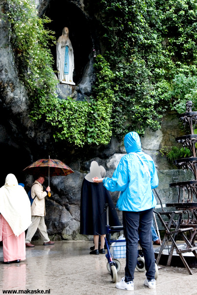 De volgende dag rijden we richting Lourdes. Daar komen we rond lunchtijd aan en willen we als eerste de grote kerk in het centrum bezichtigen. Deze blijkt gesloten te zijn tijdens lunchtijd. Omdat inmiddels de regen met bakken uit de hemel valt overwegen we tijdens onze terugtocht naar de auto om maar direct door te rijden richting Spanje. Terug in de auto besluiten we toch dat het weer ons niet van deze missie gaat afhouden. En omdat we niet willen geloven dat de katholieke Efteling tijdens lunchtijd is gesloten, besluiten we direct koers te zetten richting La Grotte van Massabielle. We worstelen onze patsersleurhut door nauwe straatjes vol Jezus en Maria winkels. Het einddoel van de dag komt in zicht: mijn bedevaartsplaats. Het grote voordeel van Lourdes is dat de plaats is ingesteld op busladingen invaliden. Je kunt dus letterlijk zo’n beetje voor de heilige grot parkeren.