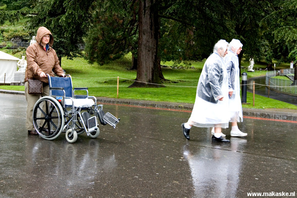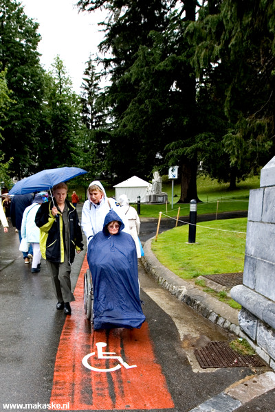 We kijken onze ogen uit. Uit de kleine straatjes stromen mensen uit alle delen van de wereld en in alle denkbare fysieke toestanden samen op weg naar een rots met een Mariabeeld. Een speciale rode strook in het wegdek markeert de baan voor rolstoelers.