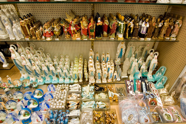 Om vervolgens handen en voeten aan onze missie te geven, stappen we resoluut de eerste de beste Mariawinkel binnen en schaffen ons een overzichtelijke jerrycan voor Bernadette en een heus mariaflesje voor onze reiskitschverzameling aan. Boven kan deze invulling van onze roeping en de daarbij behorende bijdrage aan de relicomie blijkbaar op warme steun rekenen, want als we teruglopen naar de grot om onze aankopen te vullen met het heilige water breekt de zon door.