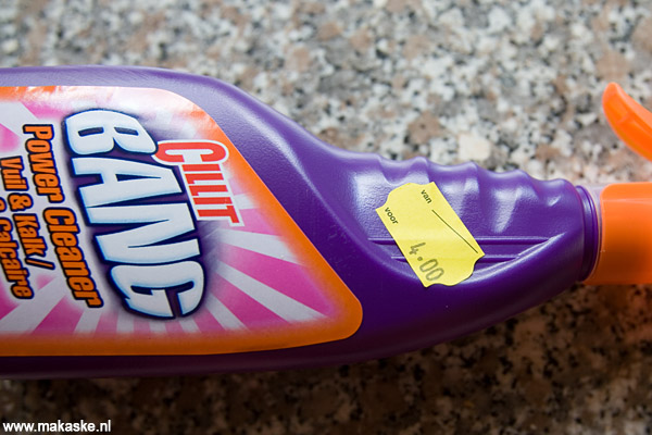 Gisteren liepen we langs de Prijsmepper. Omdat de zaak de indruk wekt erg goedkoop te zijn, gingen we even naar binnen. Daar zag Corine een spuitfles Cillit Bang. Normaal kost zo´n fles 4,99 en in deze zaak 4 euro. Omdat iedere euro toch mooi is meegenomen, sleepten we de fles mee richting de kassa.