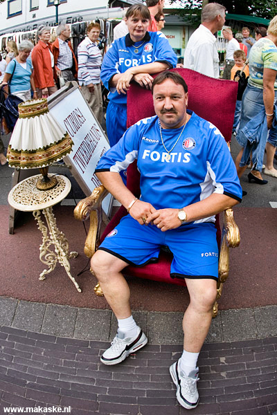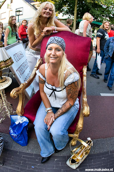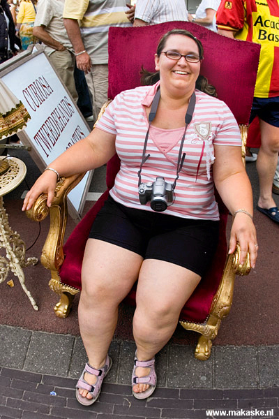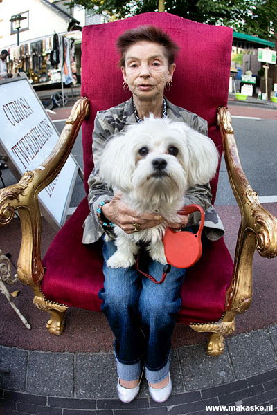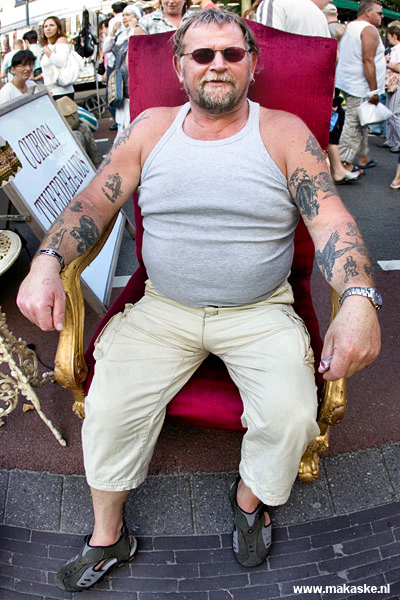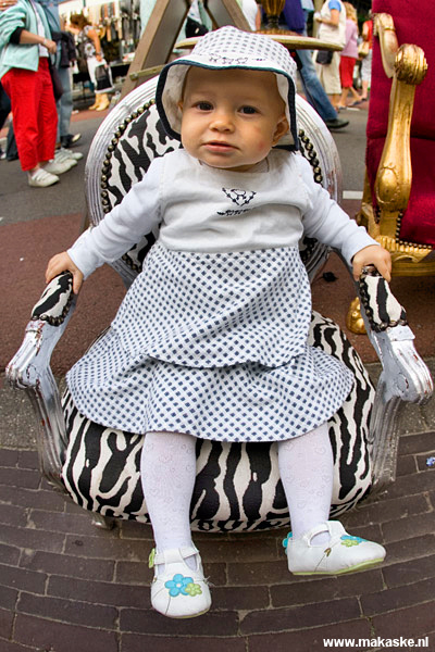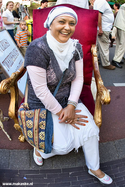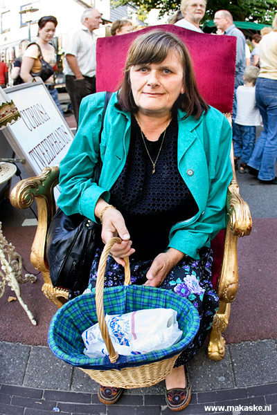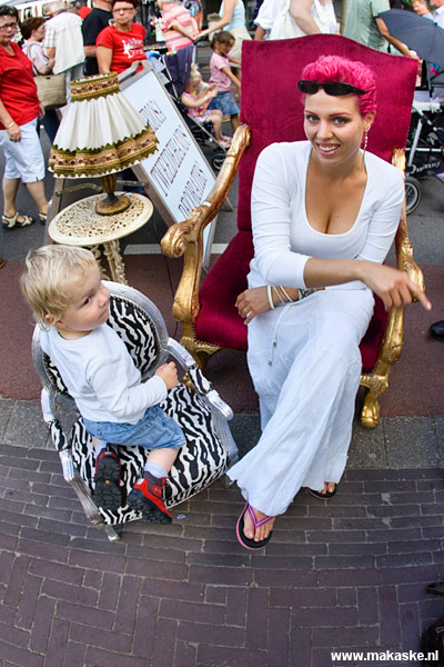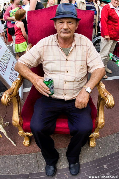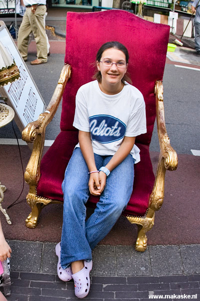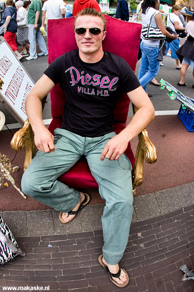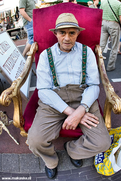 Dat bracht mij deze week op het idee om een paar stoelen bij hem op de stoep te zetten en braderiebezoekers uit te nodigen daarin te poseren voor mijn camera. Geen gedoe met belichting en aparte achtergronden... gewoon pretentieloos op straat tussen de mensen een spontane serie schieten.