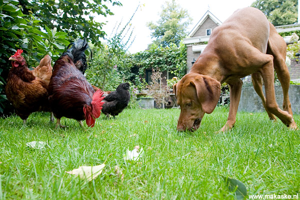 Nu het gevaar van H5N1 weer even is geweken, lopen bij ons de kippen los in de tuin. Bram vindt het allemaal best en loopt er gezellig bij en eet vrolijk mee.