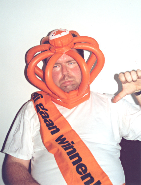Vandaag ruimde ik een la op en kwam deze foto tegen. Ooit gemaakt tijdens het EK voetbal in Nederland met oranje rotzooi dat Erica Terpstra mij had gegeven om mij enthousiast te maken (helaas voor haar... faliekant mislukt).