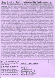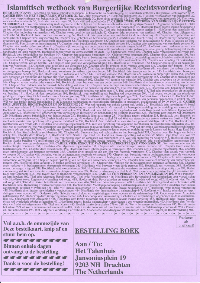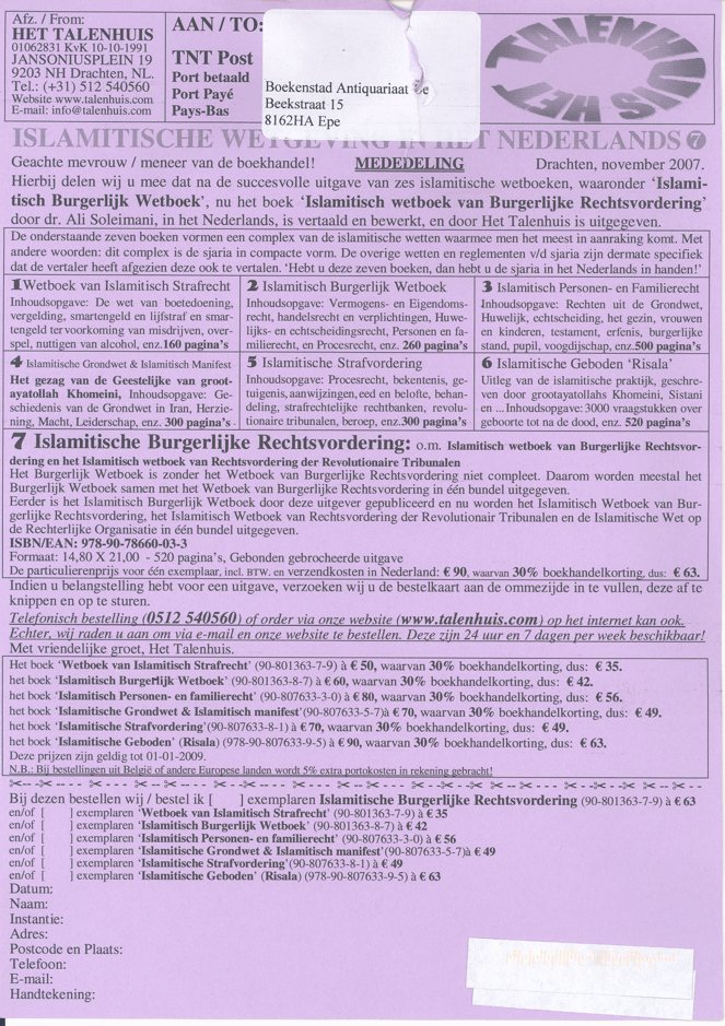 De geweldig professioneel vormgegeven 'folder' richt zich tot de geachte mevrouw/meneer van de boekhandel! De uitgever roept mij op om boeken met de vertaling van de Islamitische wetgeving in het Nederlands te gaan verkopen in mijn antiquariaat. De Islamitische revolutie is blijkbaar van start gegaan in Friesland en wil zich nu gaan verspreiden over Nederland.