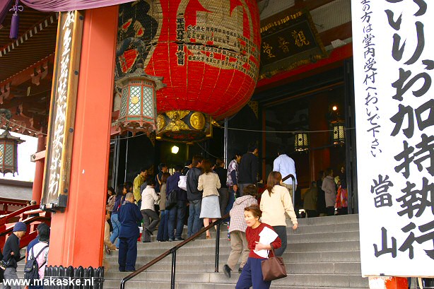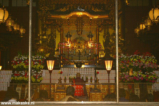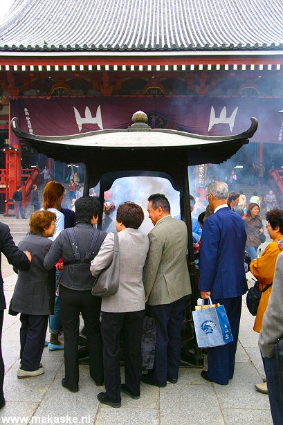 Voor de ingang van een tempelgebouw staat vaak een offerbak. De vrouw in het midden gooit geld in de bak. Vervolgens klapt ze drie keer in haar handen en sluit dan haar ogen om haar wens of boodschap - in zichzelf - uit te spreken (zoals de vrouw links op deze foto).