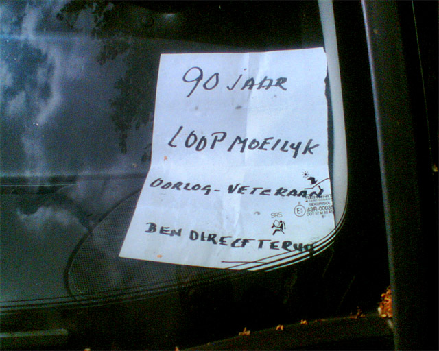 Gisteren waren we in Apeldoorn en daar stond een auto prominent op de stoep geparkeerd. De eigenaar was nergens te bekennen. Onder het raam zat dit briefje met een curieus excuus en contradictio in terminis. In het weekend van de veteranendag zal de politie er wel niet zo moeilijk over doen.