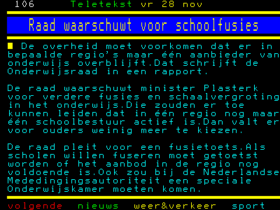 De Onderwijsraad waarschuwt voor monopolies in het onderwijs. Door de schaalvergroting en fusies dreigt de keuzemogelijkheid voor ouders te verdwijnen. Daar maakt de Onderwijsraad zich terecht zorgen over. Hier in de regio komen bijvoorbeeld alle openbare scholen onder één schoolbestuur (hetzelfde geldt overigens voor het christelijk en katholiek onderwijs). Ik ben het er mee eens dat het een ongezonde en slechte situatie is.