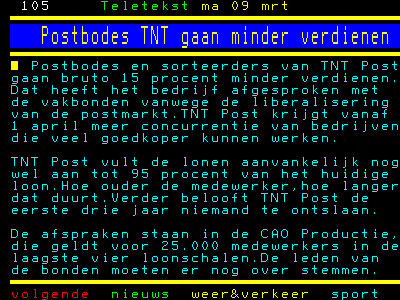 De postbodes van TNT gaan er in de komende jaren vijftien procent in salaris op achteruit. TNT heeft dit afgesproken met de bonden. De maatregel is het gevolg van de liberalisering van de postmarkt. Op zich is er niks mis met deze afspraak, mede omdat er ook is afgesproken dat er de komende jaren geen ontslagen gaan vallen onder die groep medewerkers. Het gaat hier overigens om de medewerkers in de vier laagste schalen van het bedrijf.