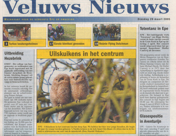 Op 29 maart stond één van mijn uilenfoto's prominent op de voorpagina van het Veluws Nieuws (huis-aan-huisblad in de regio Epe). Een late post op het weblog omdat de scanner pas nu weer aangesloten is.
