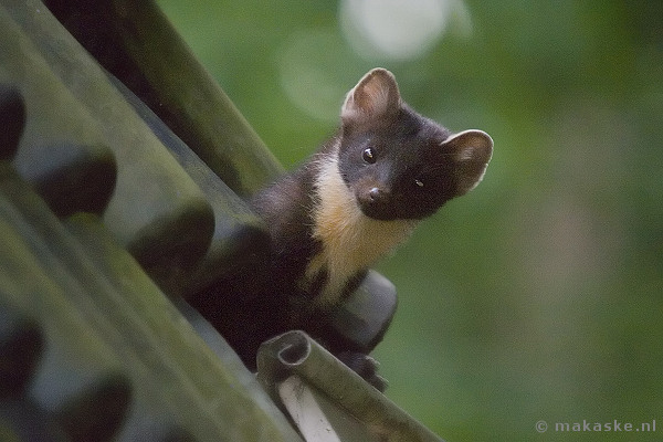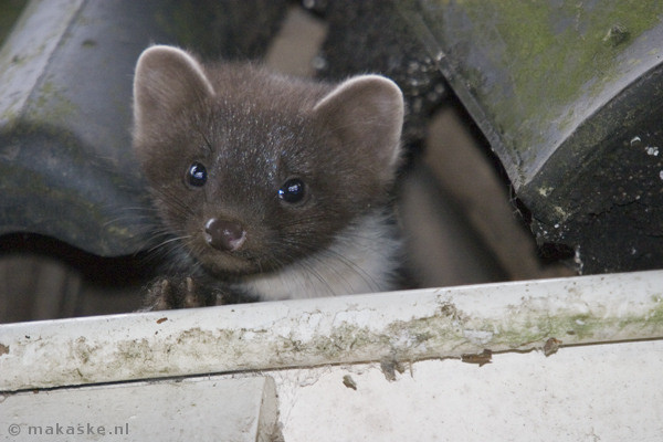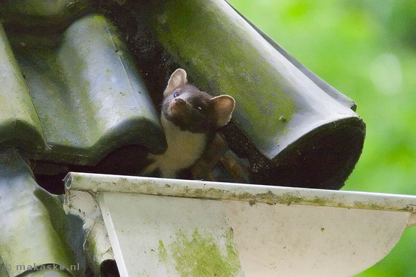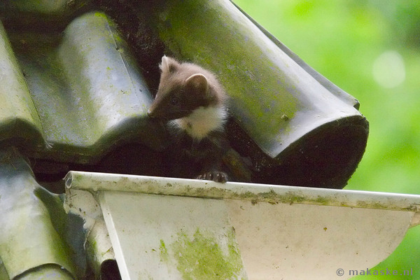 Na het ringen van de uilen ging ik nog even door naar Wapenveld. Daar was een melding dat er een boommarter een nest heeft in het dak van een villa. Ik hoefde niet te zoeken waar ik moest zijn want het was een enorme herrie van rennende en een soort blaffende beestjes.