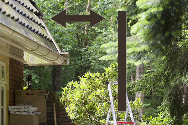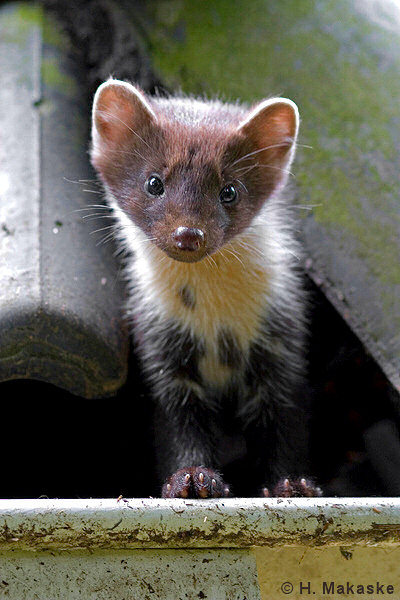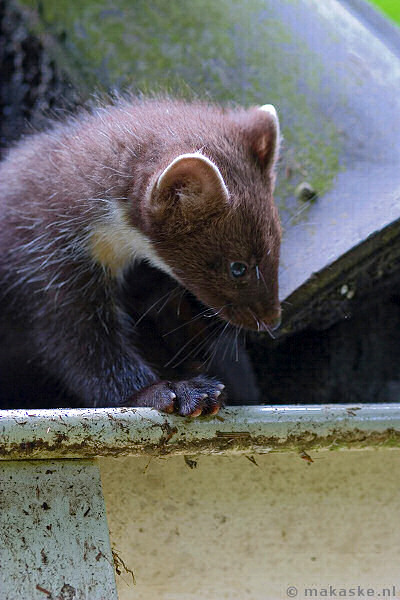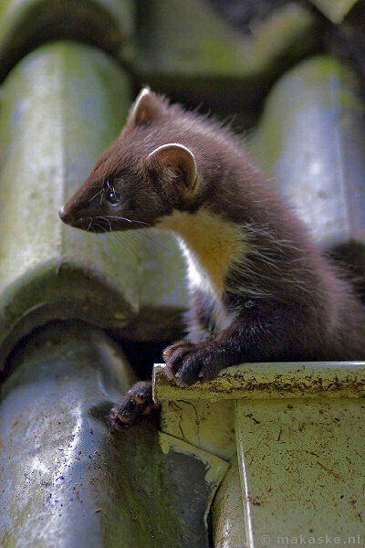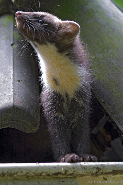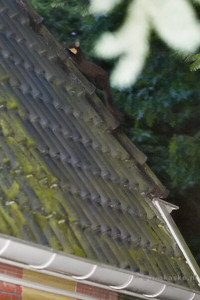 Voor het totale beeld is deze foto ook nog interessant. Hier verlaat de moeder het nest om op jacht te gaan. Deze foto is 's avonds genomen. Het dier neemt drie sprongen op het dak en verdwijnt dan in de bomen.