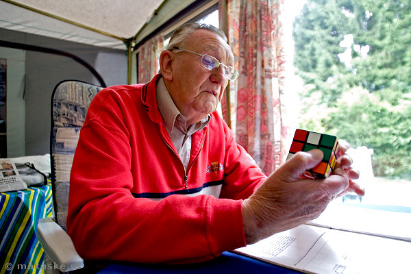 De heer Rietveld uit Nieuwpoort concentreert zich op het oplossen van de Rubiks kubus. Nadat ik mij had voorgesteld, vroeg hij mij... "zo dus u bent reporter? Dan weet u natuurlijk heel veel! Weet u de oplossing hoe ik deze twee laatste hoekjes goed krijg? Ik heb hier een boekje, maar daar staat het ook niet in."