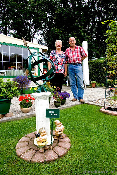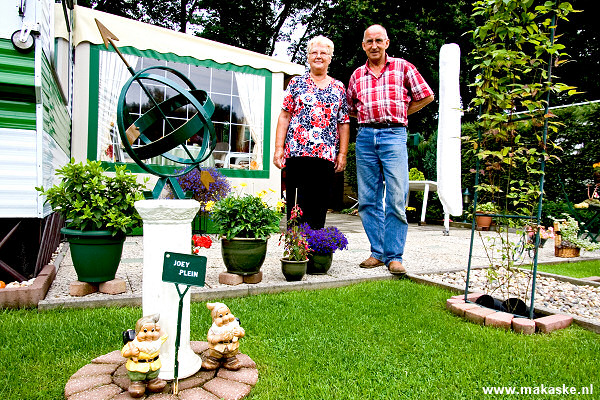 Het echtpaar tussen de drie kabouterpleintjes in hun tuin. De pleintjes zijn vernoemd naar de kleinkinderen van het echtpaar.