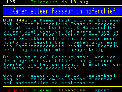 Het wordt tijd voor een duidelijke regeling waarbij de koningin niet meer bepaalt wie wat wanneer mag inzien. Haar privézaken bergt ze maar op in een persoonlijke kluis in Noordeinde. De staatszaken moeten echter worden beheerd door een onafhankelijke archiefdienst (b.v. het Rijksarchief). Dan hoeven de Kamerleden ook niet meer te slijmen. Als het om het koninklijk huis gaat, gaan 'onze' volksvertegenwoordigers zelfs diep in het stof liggen mocht dat nodig zijn.
