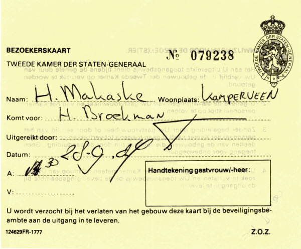 Dit is het kaartje dat ik kreeg toen ik in vandaag precies 18 jaar geleden ging solliciteren bij het Kamerlid Broos van Erp. Op het moment dat ik werd gevraagd om te solliciteren, had ik geen idee wie 'Broos van Erp' was. Ik keek in Wie is wie in de Tweede Kamer, maar kon niets vinden onder de B. Broos bleek geen dubbele achternaam te zijn, maar de voornaam van een echte katholieke banketbakker. Op 1 oktober ben ik bij hem aan het werk gegaan en pas eind februari 2003 verliet ik politiek Den Haag.