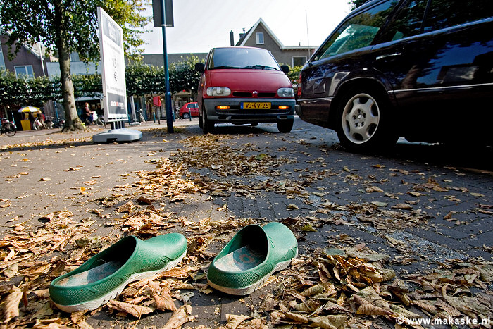 Sinds gisteren staan er twee groene klompjes naast de laden- en lossenplaats midden in het dorp. Wie loopt er nu weer naast zijn of haar schoenen? Of is er iemand ontvoerd?