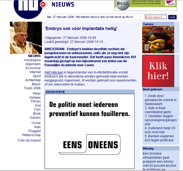 Soms zie je op www.nu.nl een zeer geestige samenloop van de inhoud van het bericht en de advertenties. Zo las ik net een doodserieus bericht over het standpunt van de paus over de rechten van nog niet teruggeplaatste embryo's. Embryo's buiten de baarmoeder hebben volgens de katholieke kerk dezelfde rechten als baby's en volwassenen. Maar zou die adverteerder met 'iedereen' ook de nog niet teruggeplaatste embryo's bedoelen?