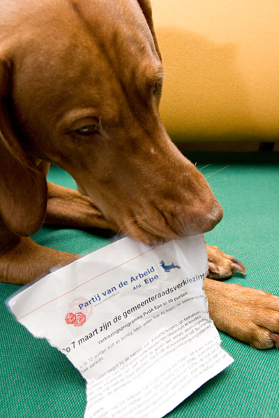 De verkiezingscampagne zit er bijna op. Het wordt tijd om een keuze te maken. Bram meent zich daar ook mee te moeten bemoeien. Hij snaaide een foldertje van de tafel en ging daar driftig mee spelen.