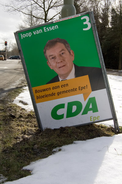 Het beeld bij de andere politieke partijen is vergelijkbaar. GroenLinks vertoont op enkele plaatsen al vrij grote scheuren en de Nieuwe Lijn haalde al voor de verkiezingen de borden van de straat. Alleen SPG-ChristenUnie... De SGP-ChristenUnie hangt overal in onze gemeente fier, onkreukbaar en recht! Maar vinden veel mensen dat niet hèt grote probleem van die partij?