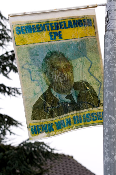 De campagne is de lijsttrekker van Gemeentebelangen Epe ook niet in de koude kleren gaan zitten. Zo te zien heeft hij veel waterschade opgelopen. Maar ja... luidt het oud-Veluwse spreekwoord niet: hoog hangende lijsttrekkers vangen veel water?