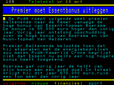 Vorig jaar was het al raak met de bonussen. Nu maakt de bestuursvoorzitter van Essent het nog bonter. En dat in jaar met meer stroomstoringen dan in de jaren ervoor en een nimmer verbeterende klantenservice. We moeten vooral op de heiloze weg doorgaan met het privatiseren van de energiedistributiebedrijven.