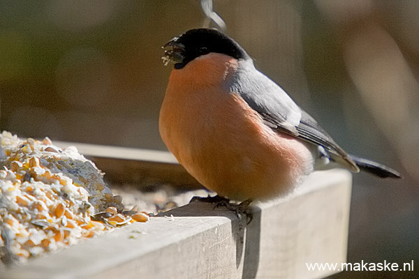 Vandaag zat ineens een goudvink op de voedertafel te snaaien. De foto is door het raam genomen.