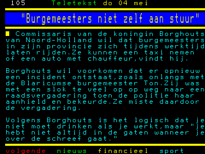 In de praktijk komt het voorstel van Borghout erop neer dat de burger kan gaan betalen voor de vervoerskosten van de burgemeester. En het wachten is op dezelfde regeling voor wethouders. Als je deze bestuurders van een auto met chauffeur voorziet, is bovendien het hek helemaal van de dam. Dan hoeven ze helemaal niet meer op te letten en kunnen ze de hele dag aan de drank. Tijdens werktijd moet je gewoon de fles laten staan. Dat geldt voor ambtenaren en voor gewone werknemers in het bedrijfsleven en waarom zou dat dan niet gelden voor bestuurders met een voorbeeldfunctie? Over waarden en normen gesproken... Misschien moeten de bestuurders eens wat vaker kijken naar de overheidscampagnes als "drank maakt meer kapot dan je lief is".