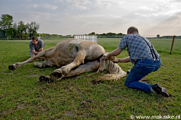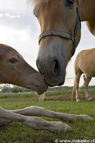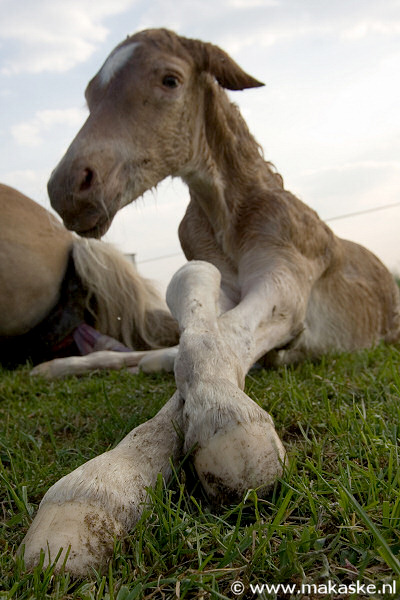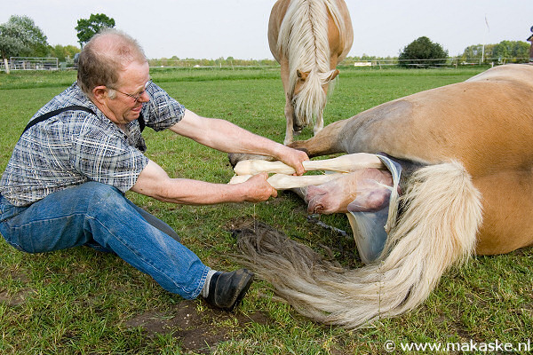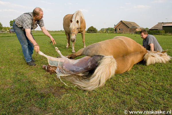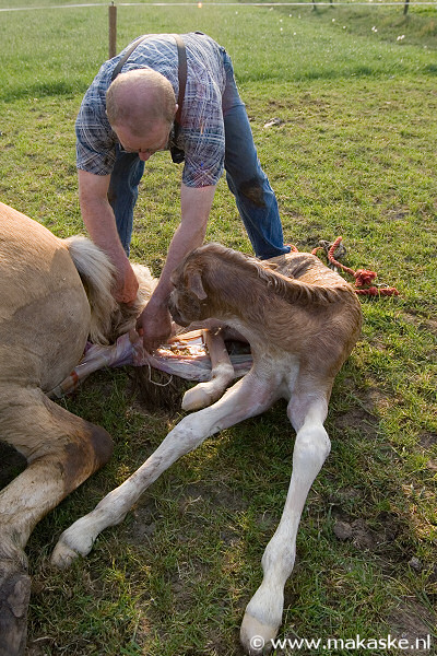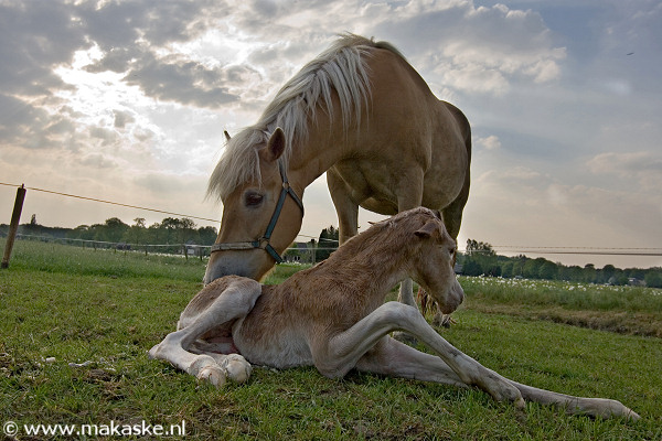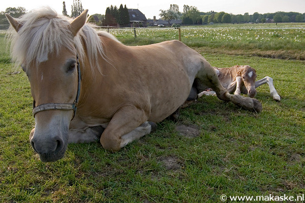 Gisteravond om kwart voor zeven ging mijn mobiele telefoon. Als ik foto's zou willen maken van het veulenen van zijn paard dan moest ik direct komen. Hoewel ik op het punt stond naar de Gemeenteraad te gaan om daar foto's te maken, bedacht ik mij geen moment en sprong in de auto om deze unieke gebeurtenis vast te leggen.
