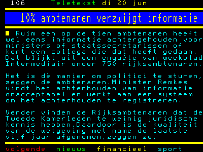 Tien procent van de ambtenaren houdt soms de kiezen stijf op elkaar om de politici te beïnvloeden. Minister Remkes is dat zat en werkt aan een registratiesysteem. Nou ben ik wel heeeeel benieuwd hoe dat systeem gaat werken. Hoe kun je in vredesnaam informatie registreren die de bewust wordt achtergehouden? Komt er vervolgens een systeem om de informatie te registreren die bewust is achtergehouden voor het registratiesysteem? En ik maar geloven dat dit kabinet de bureaucratie, de regeldruk en het aantal ambtenaren wil beperken...