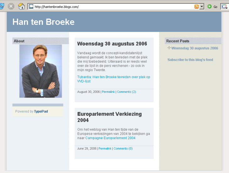 Nou, nou dat belooft wat. Een echte campaigner! Een man van deze tijd en zeker een moderne politicus heeft dan natuurlijk Internet tot zijn beschikking. Zo ook Han ten Broeke... Maar wat zie ik op zijn site: