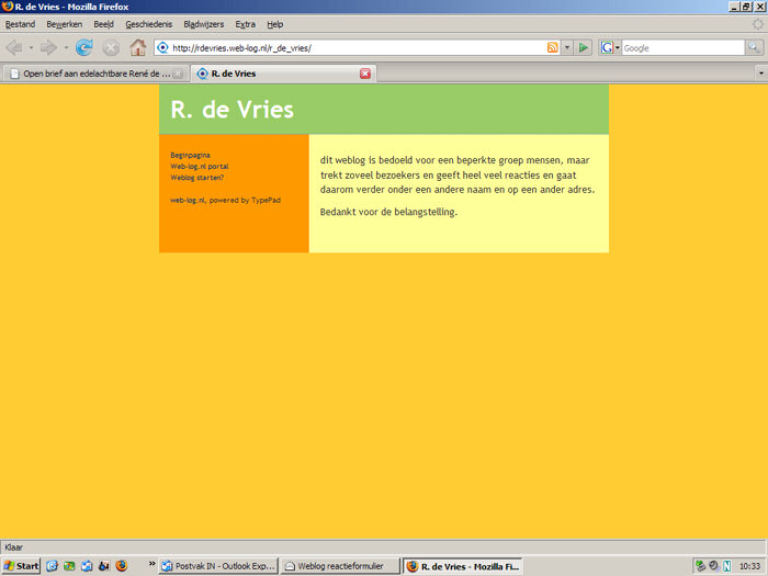 Je begint als politicus met een weblog, je haalt fors uit naar mensen die kritiek hebben op een voorstel van je eigen partij... en dan ben je blijkbaar verbaasd dat je reacties krijgt. Met verbazing las ik het mailtje van een bezoeker (Leon dank!) dat wethouder René de Vries zijn weblog heeft gesloten. Lees even mee wat hij schrijft: